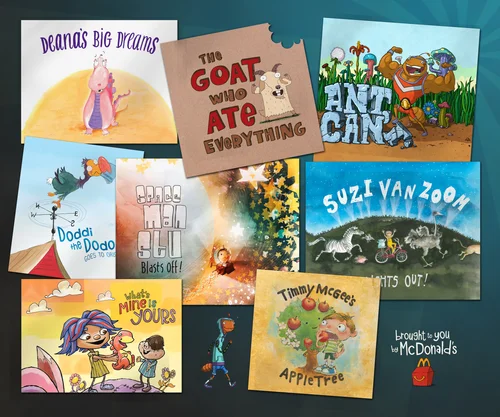 The Act: Happy Tales is a series of 8 original books based off the antics of brand characters. The books were given away inside happy Meals. Given kids the chance to improve their reading skills.
