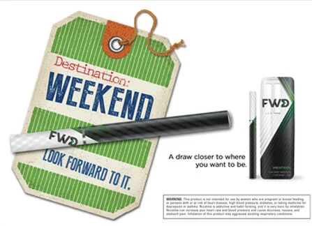 FWD e-cigs. A quick draw takes you away. I incorporated a travel tag suggesting a better place our product can put your mind regardless where your person my be.
